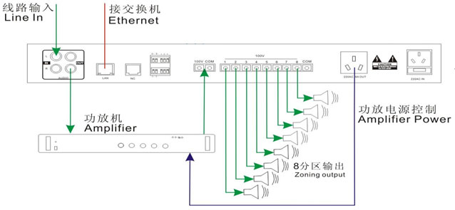 3. 先將定壓功放的功率線接回到音頻終端,然后由終端分區(qū)輸出到音箱,分區(qū)的選擇無需在終端上操作,在系統(tǒng)服務(wù)器遠(yuǎn)程控制即可;